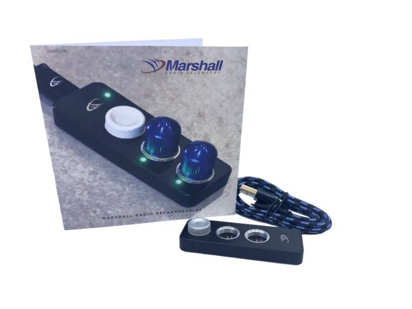 Dobíjecí baterie Marshall Radio jsou do víka zabudovány trvale, což umožňuje jednoduchý, robustní a jednodílný design. Jednoduše našroubujte vysílač a spusťte jej. Zašroubujte nabíječku a vyčkejte, až zelená kontrolka signalizuje plné nabití a připravenost k opětovnému použití. Ochranný obvod uvnitř víka vás udržuje v bezpečí.